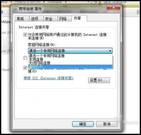 在“網絡連接”窗口中,右鍵單擊已連接到Internet的網絡連接,選擇“屬性”→“共享”,勾上“允許其他······連接(N)”并選擇“虛擬WiFi”。