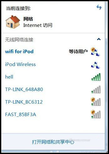 6 開啟筆記本的無線網絡.左鍵點擊右下角的網絡圖標,連接剛剛創建的wifi臨時網絡(比如我設置的“wifi for iPod”)