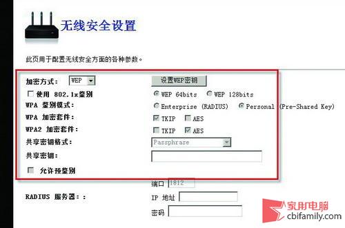 點擊“無線設置”->“安全”,如圖所示,選擇加密方式并填寫密碼。一般加密方式有兩種:WPA和WEP。根據你需要中繼的無線網絡來對應填寫,無誤后保存。