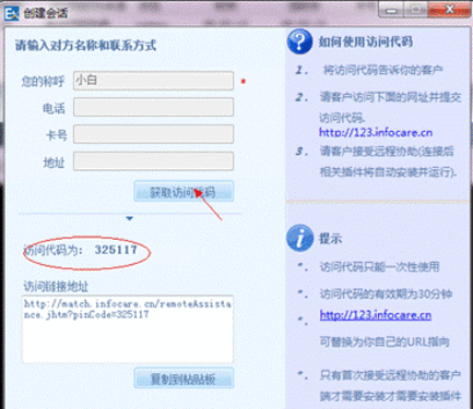 OK,得到了一串數字,這就是訪問代碼了。這時我在隊列中看到了這個會話請求,不過現在是正在連接的狀態,好了,現在我讓小白在他電腦上打開網址:123.infocare.cn 然后輸入這個訪問代碼。