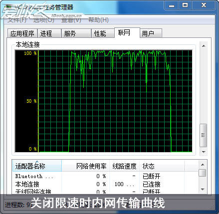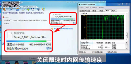 內網傳輸采用QQ文件發送,發送一個545.80MB的文件,關閉限制帶寬前和關閉限制帶寬后傳輸速度基本上沒有什么大的區別,在看一下速度的曲線,都可以達到100Mbps的傳輸速度,首先可以確定這個東西對于內網傳輸不起作用。