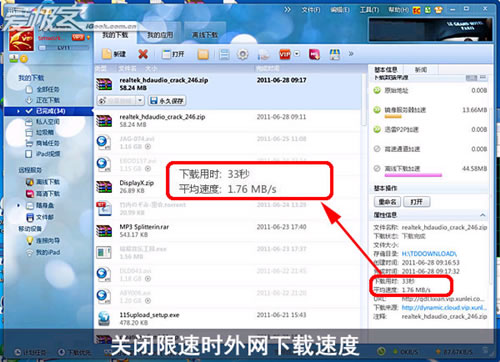 外網下載采用迅雷下載,下載一個58.24MB的文件,Tim少辦公室使用的是20Mbps的專線,下載速度可以達到2MB/s,可以看到關閉前和關閉速度基本上沒有變化,下載時間通用是33秒,下載曲線可以看到峰值基本相同,這里可以確定這個東西對于外網下載速度同樣不起作用。