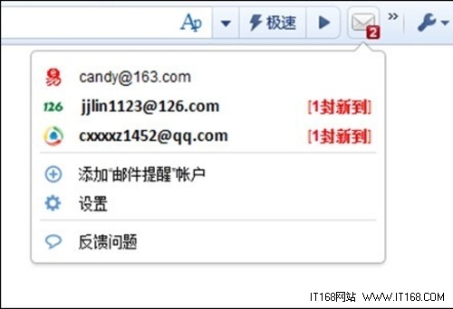 360郵件通是一個快速收取郵件的應用,只要在擴展中心提取“360郵件通”應用,輸入郵箱地址和密碼,設置接收間隔,用戶在第一時間就可以獲取郵件,避免信息晚點,“郵件通”應用不僅可以同時綁定多個郵箱賬號,無需每次登陸均輸入賬號,同時具備文字、語音提醒的功能。