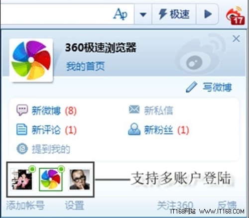▲ 360極速瀏覽器微博提醒應用增強版