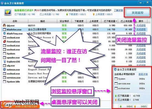 默認狀況下,只要金山衛士處于運行狀態,桌面右下角就會出現懸浮工具條,實時顯示下載和上傳流量,鼠標指針移動到上面,彈出“金山衛士流量監控”懸浮窗口,可以查看當前最占網絡帶寬的三個程序,單擊“查看詳情”,打開“金山衛士瀏覽監控”窗口,誰正在訪問網絡,上傳下載的速度和流量清清楚楚,誰拖慢網速一目了然。為了釋放網絡帶寬或阻止不安全的網絡訪問,可以關閉相關進程,如果你嫌瀏覽監控礙事,可以關閉桌面懸浮窗口,或者關閉網絡監控。
