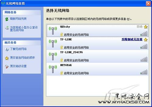 一般來說用戶可以通過路由或主機設置來隱藏無線信號的SSID網絡信息,在這種情況下我們使用XP系統自帶的無線信號掃描工具將看不到該無線網絡的蹤影,在這種情況下XP系統無線信號管理工具只能夠看到將SSID廣播的無線網絡。