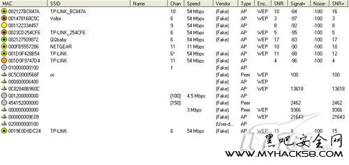 首先我們安裝netstumbler,然后選擇網卡進行掃描,從掃描到的結果中我們可以明顯看到有些網絡的SSID信息是空的,這些網絡就是隱藏了SSID廣播的無線網絡,例如本例中的MAC地址為001122334457的地址,不過就算他隱藏了SSID信息我們也可以通過netstumbler了解他的基本參數情況,例如通過后面的速度,類別,加密方式以及信號頻段等等信息我們可以了解到這個沒有廣播SSID的無線網絡具體參數信息。