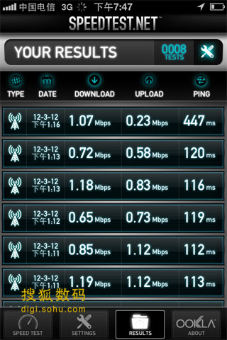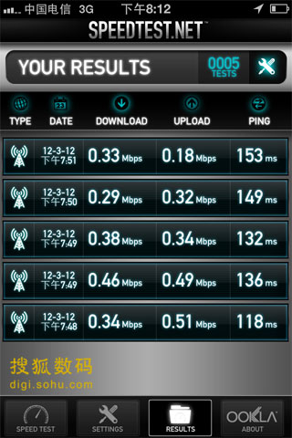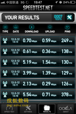 首先是一組北京昌平區回龍觀地區室內測試數據,聯通iPhone 4S下載速率最高為4.9Mbps,最低3.9Mbps;上傳最快是0.55Mbps,最低0.47Mbps。電信iPhone 4S下載速率最高為2.3Mbps,最低1.2Mbps、上傳速率最快為1.7Mbps,最低0.8Mbps。