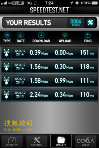 對比聯通和電信iPhone 4S在北京的3G網絡使用情況,首先這兩張3G網絡作為手機瀏覽已經夠用,如果不是特別強調網速,兩者差別不大。二者的優劣在于,電信EV-DO的網絡比較穩定,可能于相對用戶偏少有關,缺點是下行網速比較慢,但上傳不錯。聯通WCDMA網絡的優勢在于下載網絡很快,信號好的地方5Mbps以上沒有問題,缺點是網絡波動明顯,同時上行速度偏慢。