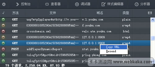 如上圖所示,接著,你找到“域名”那列出現(xiàn)“127.0.0.1”那行,鼠標(biāo)點(diǎn)擊右鍵,會(huì)看到“Copy URL”(復(fù)制鏈接的意思),再用鼠標(biāo)點(diǎn)擊“Copy URL”,這時(shí)你已經(jīng)復(fù)制了真實(shí)視頻文件的地址。