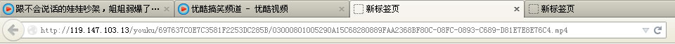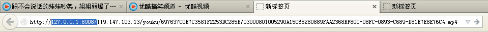 看到了吧,這是一個(gè)MP4的視頻文件,這時(shí),我們只需要把“127.0.0.1:8908/”或“127.0.0.1:8909/”這段去掉,剩下的就是優(yōu)酷該視頻的真實(shí)文件地址了,如下圖所示