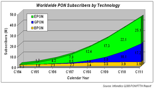 國際研究機構Point Topic所公布全球寬帶統計調查數據顯示,至2010年第四季度止,FTTx用戶達到了7500萬。