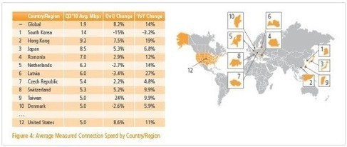 Akamai近日公布最新調查數據,全世界平均網速環比上一季度,增加8.2%,同比2009年增加14%。近幾年網絡基礎建設發展快速的韓國,網速以14Mbps位居世界第一,是全球平均網速1.9Mbps的7倍以上。另外,香港以9.2Mbps排名第二,日本8.5Mbps排名第三,羅馬尼亞7.0Mbps排名第四,荷蘭6.3Mbps排名第五,而IT大國美國則以5.0Mbps僅居第12位。此外,俄羅斯手機下載速度以每秒6Mbps位居世界第一,甚至超越了美國的網絡速度。