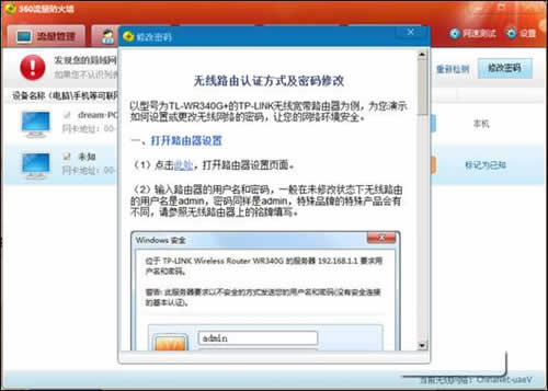 如果確定被蹭網,也不用過度擔心,只要單擊“修改密碼”按鈕,360流量防火墻會給出詳細的修改密碼方法。