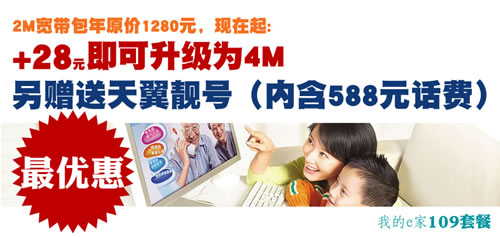 杭州電信近日推出新套餐,e9-109套餐。該套餐優惠多多,原2M寬帶包年價格1280元,現在只需要加28元,即可升級到4M,另外還贈送天翼靚號(內含588元話費),真是機不可失哦。