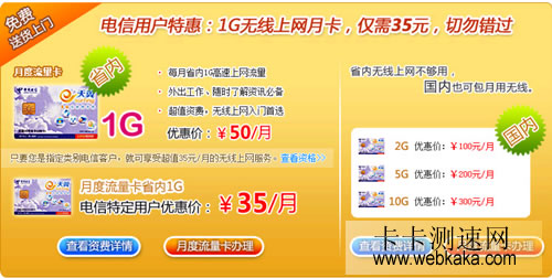 | 月度流量卡 | 1G | 35元 | 省內使用 | 1X/3G上網統一國內(不含港澳臺)不分漫游0.0003元/KB,不足1KB按1KB計費,不足0.01元按0.01元計費。 WIFI上網:統一國內(不含臺港澳)不分漫游0.03元/分鐘。 | 1、無線寬帶套餐只開通無線上網、語音、短信、Wi-Fi功能。 2、默認開通Wi-Fi功能。 |