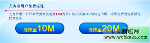 光寬帶用戶可以享受免費提速至10M寬帶,購買高清ITV加裝包的用戶還可免費提速至極速20M寬帶