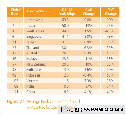 在平均峰值連接速度比較中,排在第一位的則是香港,日本和韓國緊跟其后,他們峰值分別為63.6Mbps、50.0Mbps、44.8Mbps。