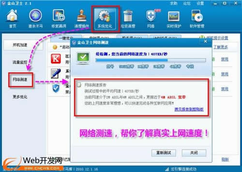 運行金山衛(wèi)士,進(jìn)入“系統(tǒng)優(yōu)化”窗口,單擊左側(cè)導(dǎo)航欄上的“網(wǎng)絡(luò)測速”按鈕,彈出“金山衛(wèi)士網(wǎng)絡(luò)測速”小窗口,并自動開啟測試網(wǎng)絡(luò)速度,測試結(jié)束給出測試報告,當(dāng)前網(wǎng)絡(luò)速度、網(wǎng)絡(luò)狀況一清二楚(如圖)。