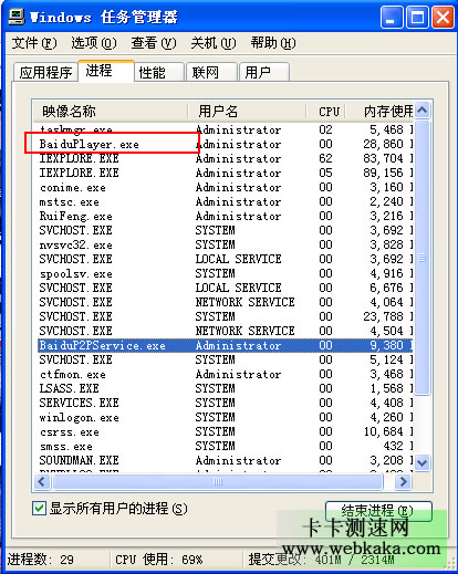 打開任務管理器,先看看如下圖,有沒有一個百度播放器的進程BaiduPlayer.exe?應該有把,這就對了,首先把這個進程強行結束掉,然后,再去關閉那個baidup2pservice.exe進程。
