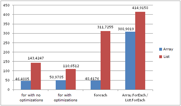 該圖顯示 FOR 和 FOREACH 在遍歷數(shù)組時花費相同的時間。也是因為CLR優(yōu)化將FOREACH轉(zhuǎn)換為FOR,并以數(shù)組的長度作為最大迭代邊界。不管數(shù)組長度是否緩存(使用FOR時),結(jié)果都差不多。