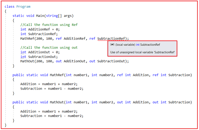 當我們使用 ref 參數時,你必須初始化 ref 參數,否則你會得到編譯時錯誤。這是因為使用 ref 參數,更新方法內部的值是可選的。因此,在傳遞 ref 參數之前,應該對其進行初始化。另一方面,初始化輸出參數是可選的。如果你沒有初始化 out 參數,沒問題,因為 out 參數是在方法內部強制初始化或更新的。為了更好地理解,請看下面的代碼。在這里,我們沒有初始化第二個參數。對于 SubtractionOut 參數,我們沒有得到任何錯誤,但是對于 SubtractionRef,我們得到一個編譯器錯誤,提示使用未分配的局部變量“SubtractionRef”,如下所示。