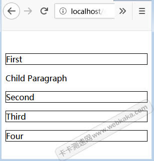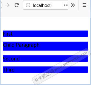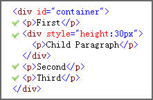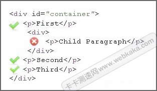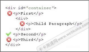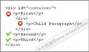 它針對的P元素是div容器的直接子元素,不能是子div的子元素。