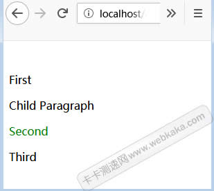 它將只選擇前一個選擇器緊跟的第一個元素。在我們的示例中,它的目標僅為Second,因為主p元素剛好位于DIV標記之后。