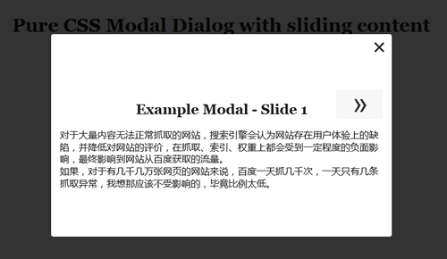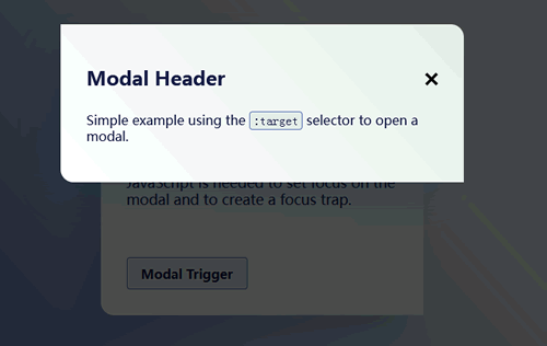 在這個例子中,展示了如何使用 CSS :target 選擇器打開一個模態窗口。同樣,它不使用任何 JavaScript 代碼。
