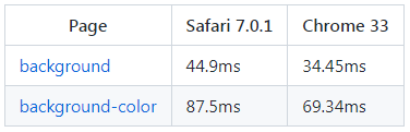 當使用background而不是background-color時,在 Safari 7.0.1 中,這節省了近 42.6 毫秒,幾乎快了一倍。Chrome 33 似乎也差不多。
