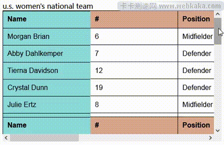 本實例是純CSS實現,可水平、垂直滾動table表格。水平滾動時,固定表格第一列;垂直滾動時,固定表格第一行和最后一個行。