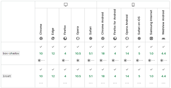 如果沒有指定inset,默認陰影在邊框外,即陰影向外擴散。 使用 inset 關鍵字會使得陰影落在盒子內部,這樣看起來就像是內容被壓低了。此時陰影會在邊框之內 (即使是透明邊框)、背景之上、內容之下。
