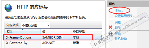 進入 HTTP 響應標頭 設置界面,點擊“添加...”,然后“名稱”輸入 X-Frame-Options ,“值”輸入 SAMEORIGIN ,點擊“確定”按鈕,就完成了設置。
