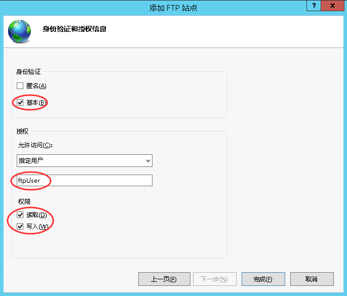 身份驗證勾選“基本”;授權“指定用戶”,填寫剛創建的FTP用戶名;權限勾選“讀取”和“寫入”。