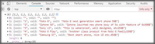 這里我們創建一個數組變量arrData,用于存儲HTML表數據。 使用下面編寫的jquery代碼,我們可以將完整的HTML表數據保存到javascript數組對象中。