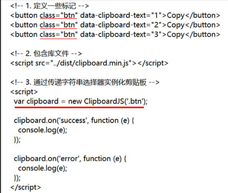 前文介紹過文本復制的實現(xiàn)方法,無需JS插件,代碼也比較簡少,不過其對IE瀏覽器的支持不好。今天,我特地找了一個支持各種瀏覽器的文本復制實現(xiàn)方法,是利用第三方JS插件來實現(xiàn)的,該插件是clipboard.js。