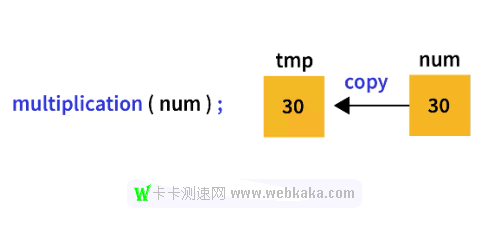 之后,我們將變量 num 傳遞給乘法函數(shù)。Javascript 自動將變量 num 的值復制到變量 tmp。所以,這里的 tmp 是一個新變量,它在內(nèi)存中分配了一個新的空間,并且與 num 無關(guān)。