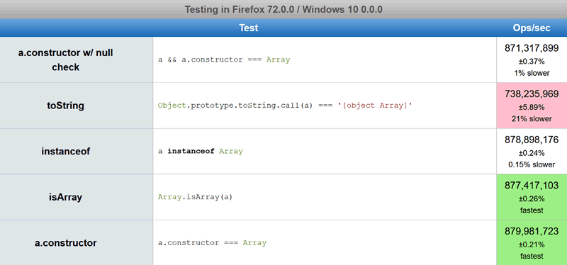 但是,如果你是 Object.prototype.toString.call([]) 的粉絲,請不要擔(dān)心!差異表明,這種稍慢的方法仍然非常快:在我的家用 PC 上每秒執(zhí)行超過 700,000,000 次操作。