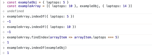 exampleArray.indexOf({ laptops: 10 }) // -1
