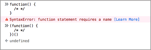 那些環(huán)繞的括號實(shí)際上是使我們的函數(shù)在內(nèi)部被視為表達(dá)式的原因。否則,函數(shù)聲明將無效,因?yàn)槲覀儧]有指定任何名稱:
