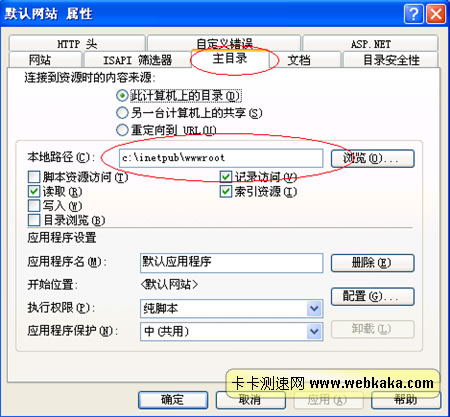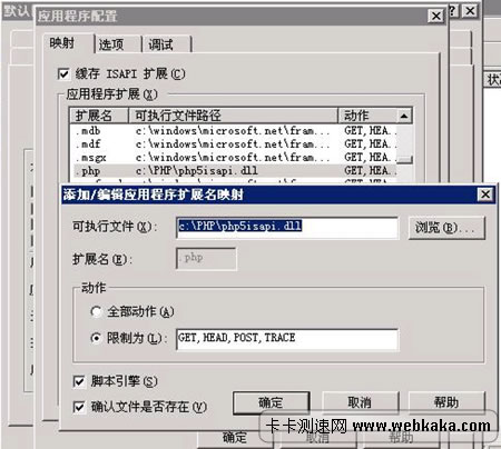 打開Internet 信息服務(IIS)管理器->本地計算機->網站->默認網站。右擊默認網站,選擇右鍵菜單里面的屬性,會出現網站的屬性設置窗口。然后我們選擇“主目錄”選項卡,點擊里面的“配置”按鈕。然后在“應用程序配置”窗口中點擊“添加”按鈕,在“擴展名”中輸入“php”,在“可執行文件”中將上面步驟1)所提到的C:\php\php5isapi.dll 添加到里面去,動作限制為“GET,HEAD,POST”。