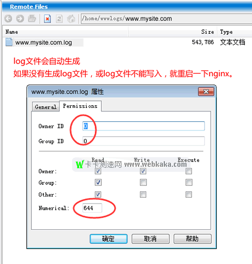 網站log文件權限在FTP里直接設置,Owner ID 和 Group ID 均為0,權限是644。請看下圖。