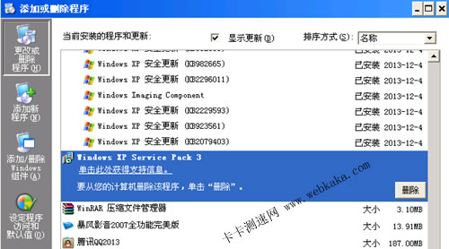 登錄安全模式后,立即到“添加/刪除程序”那里看能否刪除xp sp3,嘿嘿,有個卸載xp sp3的條目。下圖所示:
