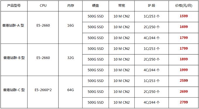 香港站群服務器均采用頂級品牌硬件,全新E5系列CPU,配備RECC錯誤檢驗內存條,搭載高速SSD固態硬盤,獨立IP,獨享網絡帶寬,高速穩定,性能卓越,具體配置及價格如下: