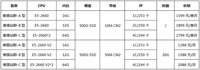 香港站群服務(wù)器/美國(guó)多IP站群服務(wù)器,均支持1C/2C/4C等不同C段,多達(dá)253個(gè)獨(dú)立IP!雙向BGP+CN2 GIA直連線路,速度快,延遲低,更利于SEO搜索引擎優(yōu)化。