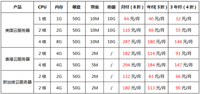 香港/美國(guó)/新加坡海外云服務(wù)器,月付8折,年付5折,三年付4折,購(gòu)買時(shí)間越長(zhǎng)越優(yōu)惠!美國(guó)vps云服務(wù)器下單贈(zèng)送10G防御,活動(dòng)配置帶寬,買5M得10M,買10M得20M,更多配置詳見活動(dòng)頁(yè)!