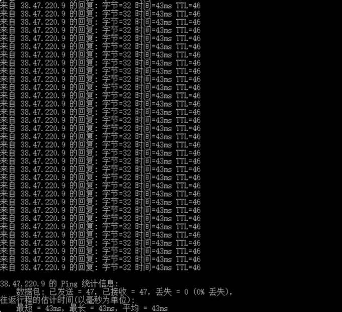 可以看到本地Ping的平均延遲在43ms,這個延遲對于香港云服務器來說還是相當不錯的,并且網絡非常的穩定,基本沒有丟包的情況。