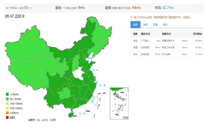 可以看到全國三網Ping的平均延遲在42ms左右,其中電信網絡延遲42ms左右,聯通網絡延遲38ms左右,移動網絡延遲51ms左右。