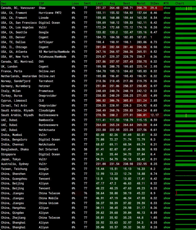 下面我們再看看全球各節點網絡穩定性,如下所示︰