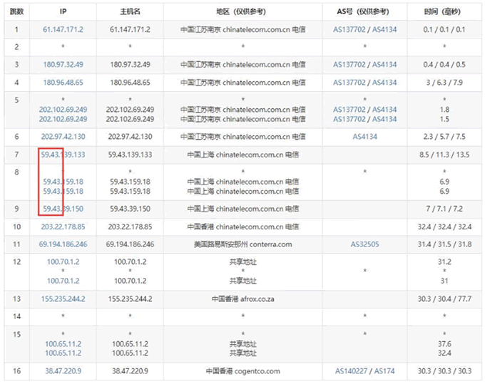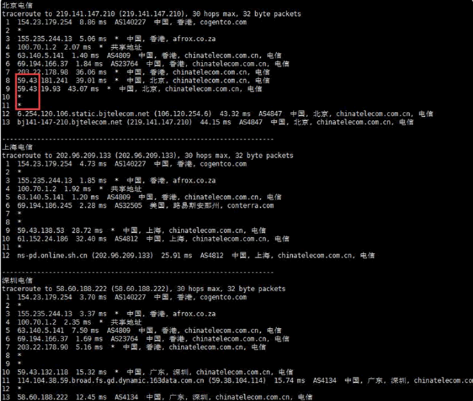 所以總結下三網的去程和回程路由︰電信雙向CN2、聯通雙向AS4837、移動雙向CMI。